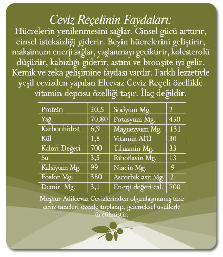 Orta Asya insanının uzun yaşama ve dinç olmasının sırlarından olan doğal doping olarak isimlendirilen yeşil ceviz reçelini ELCEVAZ Markasıyla sizlerle buluşturuyoruz. Şimdilerde halk arasında doğal viagra olarak anılan ceviz reçeli cevizin ham halinden elde ediliyor. Meşhur Adilcevaz Cevizlerinden özenle seçilen olgunlaşmamış yeşil cevizler, kabuğu soyulduktan sonra doğal işlemlerden geçirilerek elde ediliyor. Yılın sadece bir ayında toplanan yeşil cevizlerden reçel elde etme süreci cevizlerin toplanmasıyla birlikte yaklaşık bir ay sürüyor. Yöre halkının şifa niyetine yediği ceviz reçeli ayrıca özel misafirlerede özenle ikram edilen bir tatlı türüdür. Anzer balı öteki ballardan ne derece farklıysa, Adilcevaz Cevizi’de kabuk kalınlığı, iç verimi, yağ oranı ve tadıyla diğer cevizlerden farklıdır. Yapılan araştırmalarla ortaya çıkan ceviz reçelinin faydalarından bazıları şöyle ; Şifa amaçlı olarak kullanılır. Hücreleri yeniler, cinsel gücü arttırır, cinsel isteksizliği giderir.
